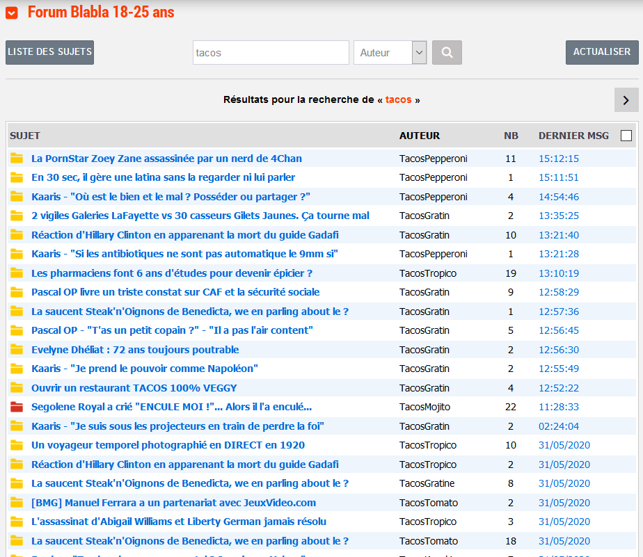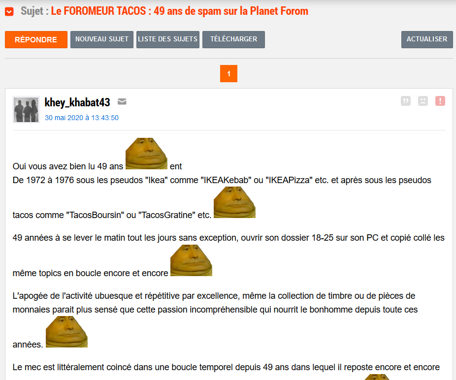 Le forumeur Tacos est un Boucleur notoire qui ne semble pas avoir d'idées ou de but précis, mais il y a des topics nominatifs récurrents sur lui du type "Le FORUMEUR TACOS : XX ans de SPAM sur les forums", on ignore si il en est lui-même l'auteur et si il s'agit de la même personne, mais ce cinglé passe ses journées à poster ce sujet de manière répétée depuis des années.