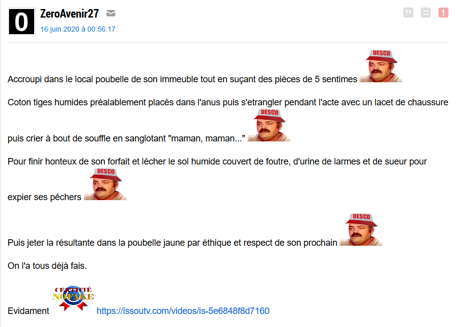 ZeroAvenir est un forumeur qui spam depuis des mois (voire des années) des topics avec le titre "se branler NU accroupis en criant et en suçant des pièces de 5 sentime" et comme message "on l'a déjà tous fais". Il poste parfois même des vidéos -probablement de lui-même- où il se trouve dans le fameux local poubelle, et suce une piège de 5 centimes, tout en se masturbant, dénotant d'une vraie pathologie mentale.
